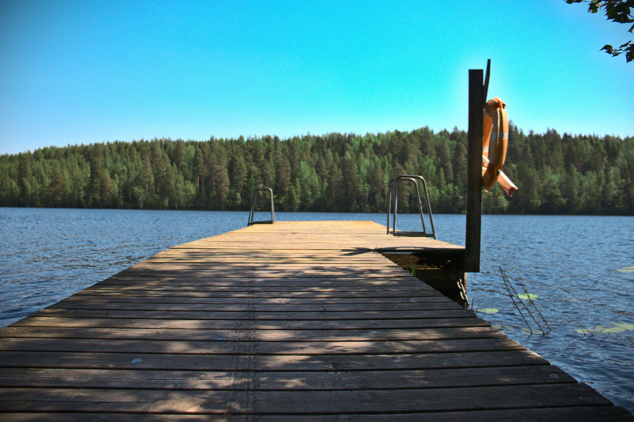Rannassa on laituri ja soutuvene. Laiturilla on raput kummallekin puolelle.